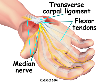 The median nerve and flexor tendons pass through the carpal tunnel. The median nerve rests on top of the tendons, just below the transverse carpal ligament. The flexor tendons are important because they allow movement of the fingers, thumb, and hand, such as when grasping. The tendons are covered by a material called tenosynovium. The tenosynovium is a slippery covering that allows the tendons to glide next to each other as they contract and relax to move the hand and fingers.